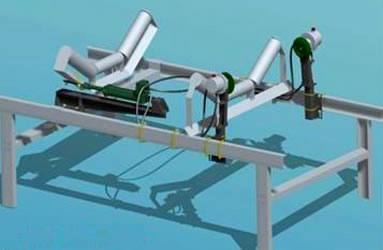 因調心托輥旋轉后使皮帶收縮,會對檢驅輪工作始點產生影響。為了減小這種影響,檢驅輪、泵組件安裝位置必須離調心托輥150mm以上,放在調心托輥前后均可。在沒有調節好糾偏支架座及糾偏支架位置之前,螺栓的螺母先不要旋緊,使支架座架能自由滑動,糾偏支架能輕松上下滑動,待確定位置之后,再擰緊螺母。